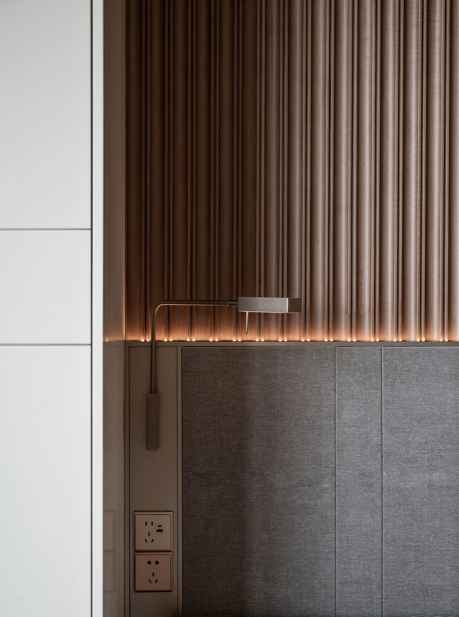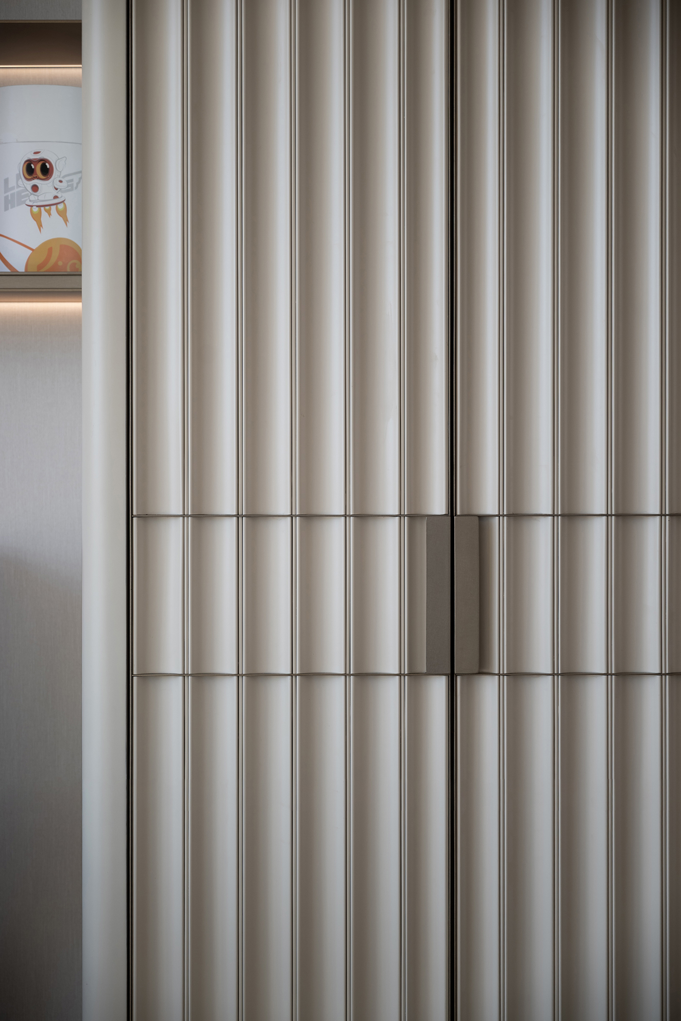 Modern design can sometimes feel cold, but not here. We added warmth and rhythm using fluted (ribbed) wood textures. You can see this signature touch on the bespoke double doors and the wardrobe details. Creating these deep, consistent grooves requires advanced CNC machinery and careful hand-sanding. We even integrated this texture into the bedroom headboards, combining the wood ribbing with soft ambient lighting and upholstered panels for a cozy, hotel-suite vibe.