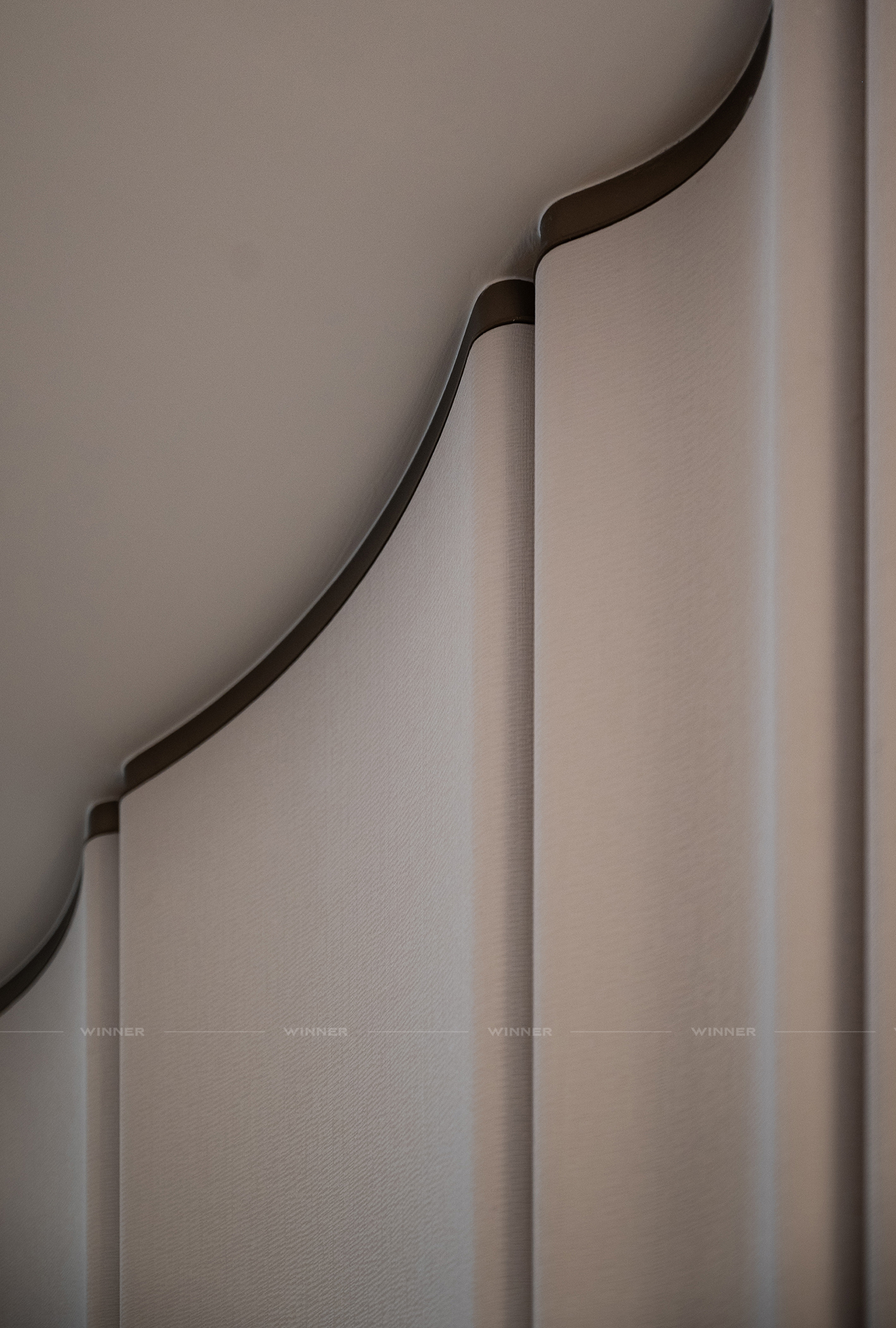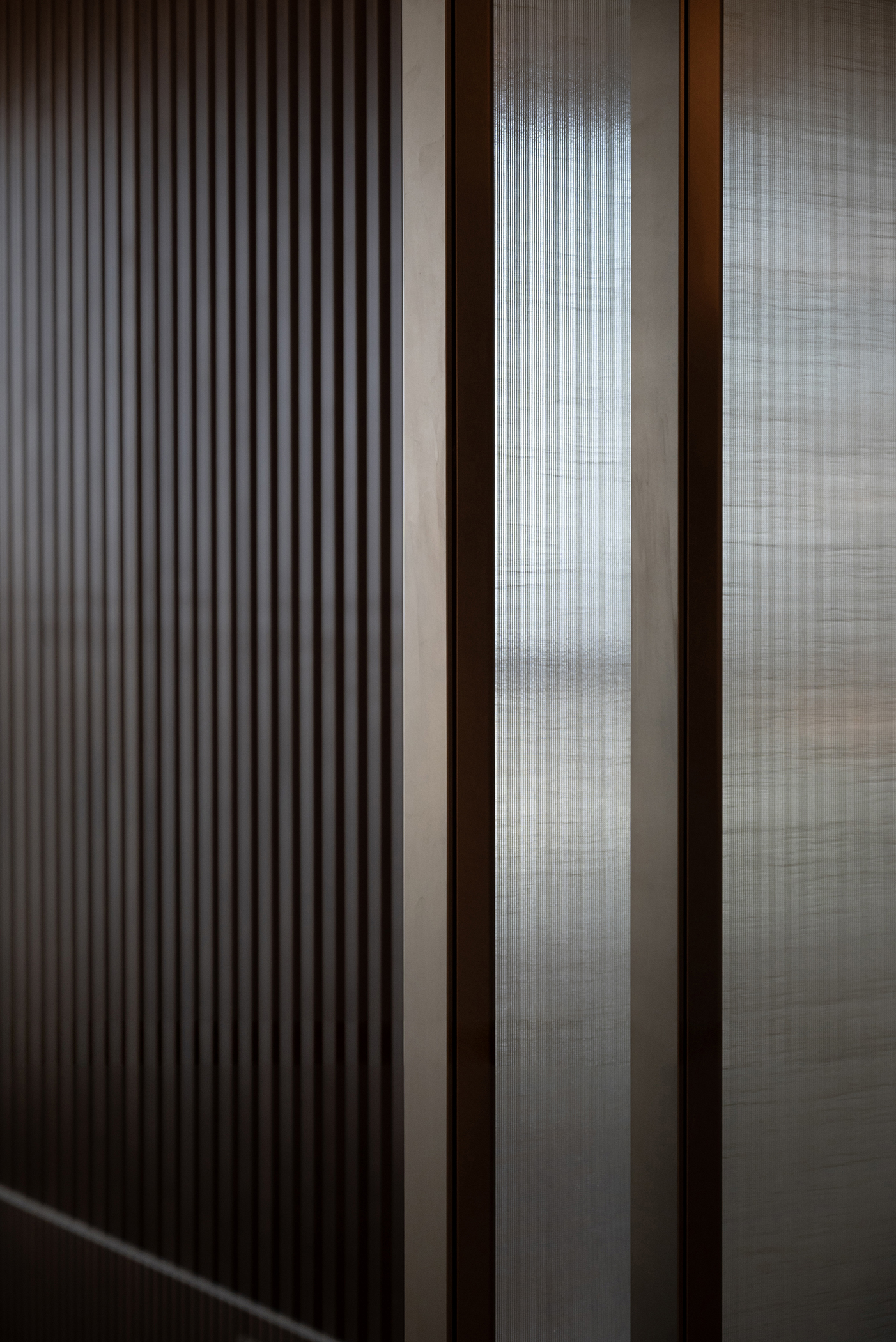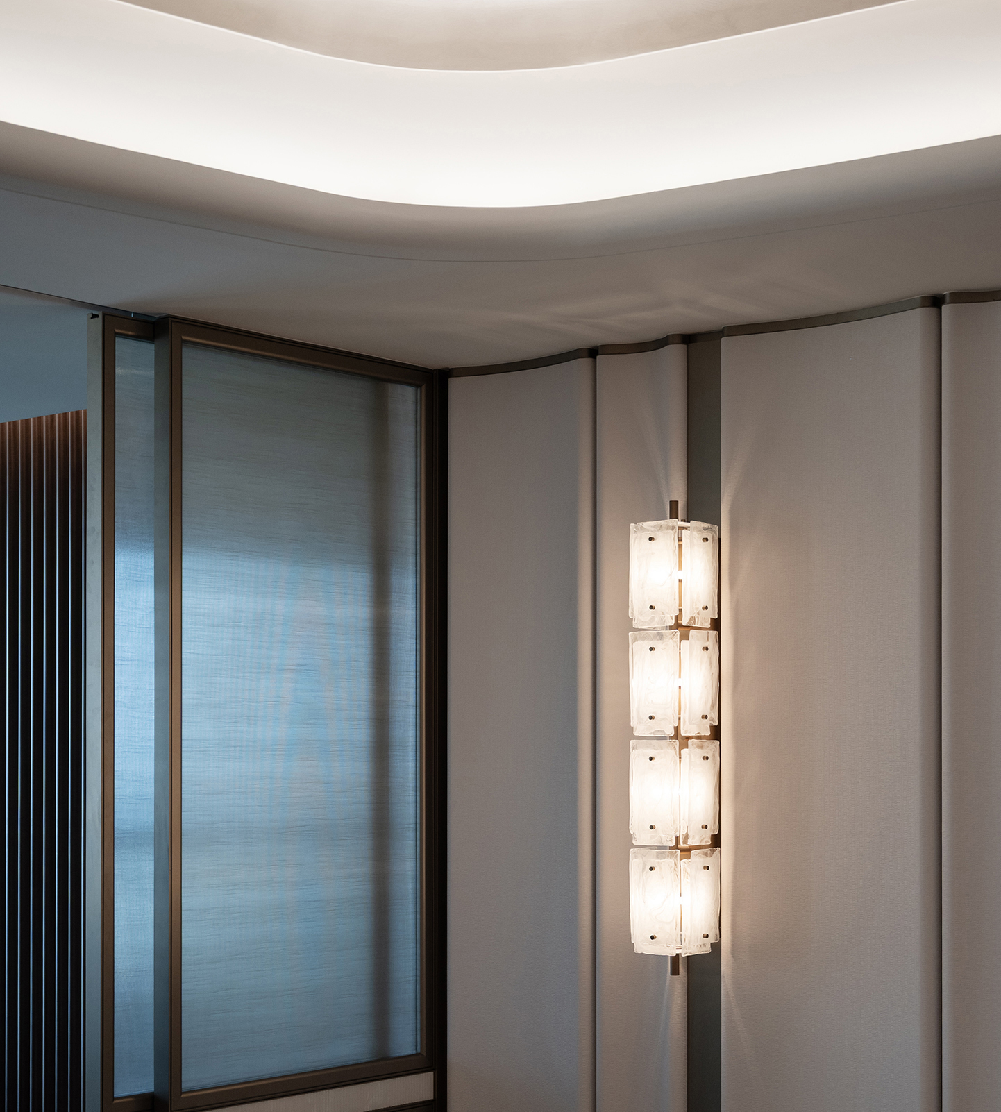 True craftsmanship shows in the difficult corners. Check out the elevator entrance. Instead of a sharp, boxy corner, we manufactured a curved dark wood panel that wraps smoothly around the wall. It softens the space and guides you naturally toward the lift. We also love mixing materials. Throughout the villa, you'll find exquisite details like bronze metal frames paired with textured glass and fabric. These small touches of metal add a sharp, sophisticated contrast to the softness of the wood and fabric.
