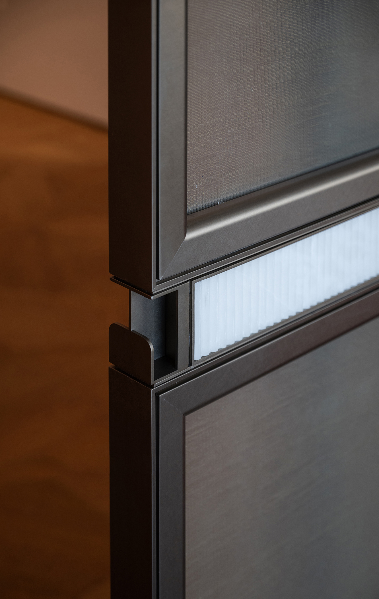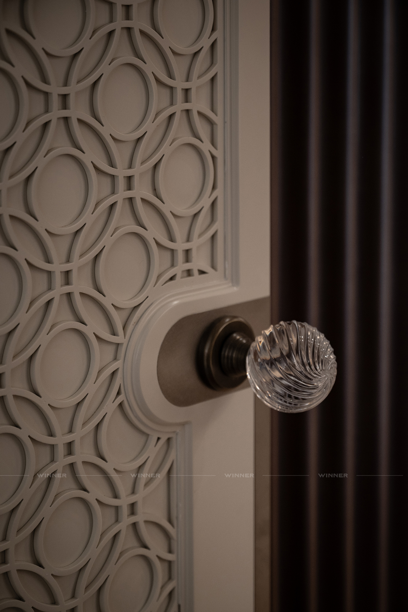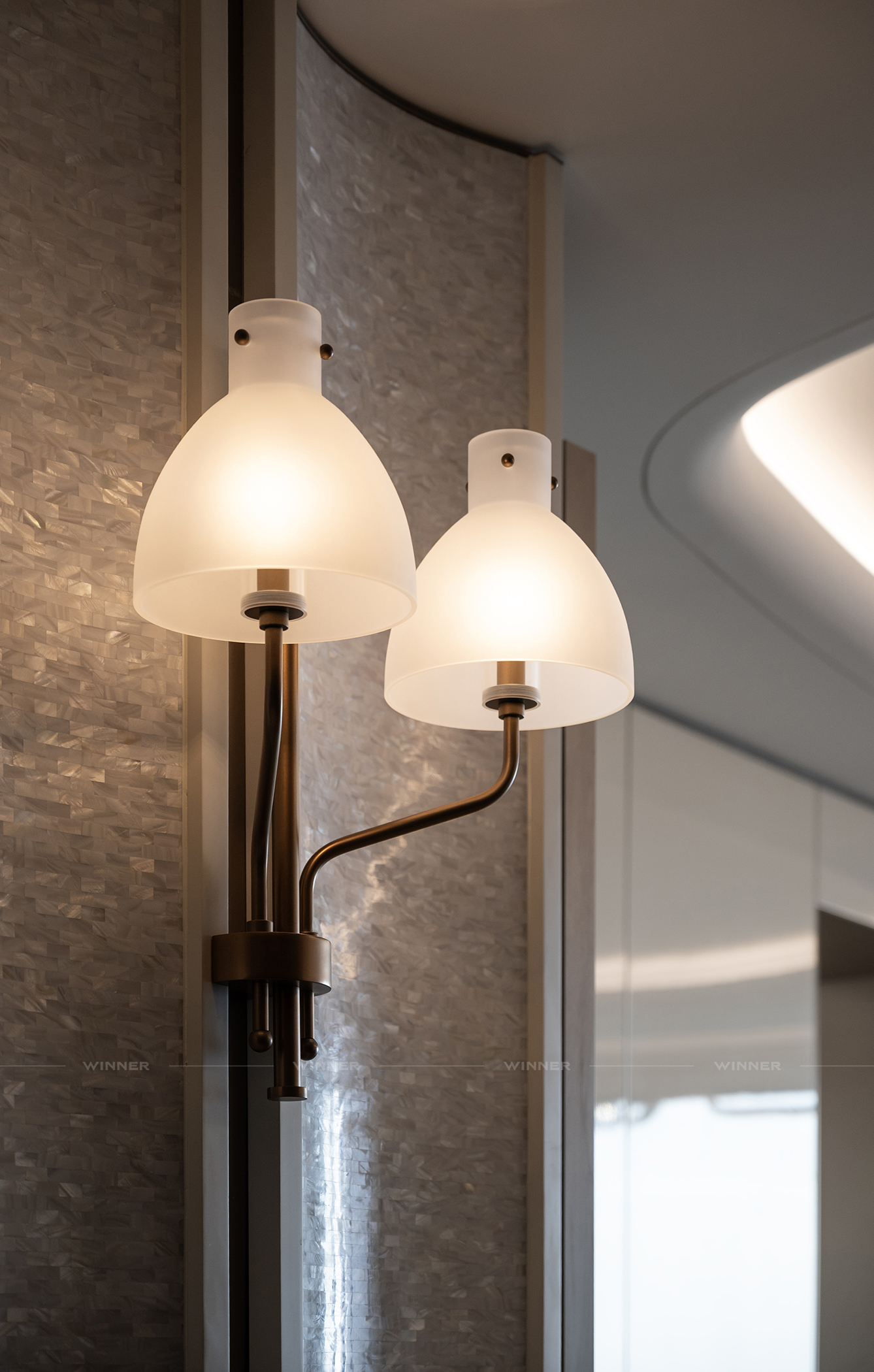 True craftsmanship shows in the difficult corners. Check out the elevator entrance. Instead of a sharp, boxy corner, we manufactured a curved dark wood panel that wraps smoothly around the wall. It softens the space and guides you naturally toward the lift. We also love mixing materials. Throughout the villa, you'll find exquisite details like bronze metal frames paired with textured glass and fabric. These small touches of metal add a sharp, sophisticated contrast to the softness of the wood and fabric.