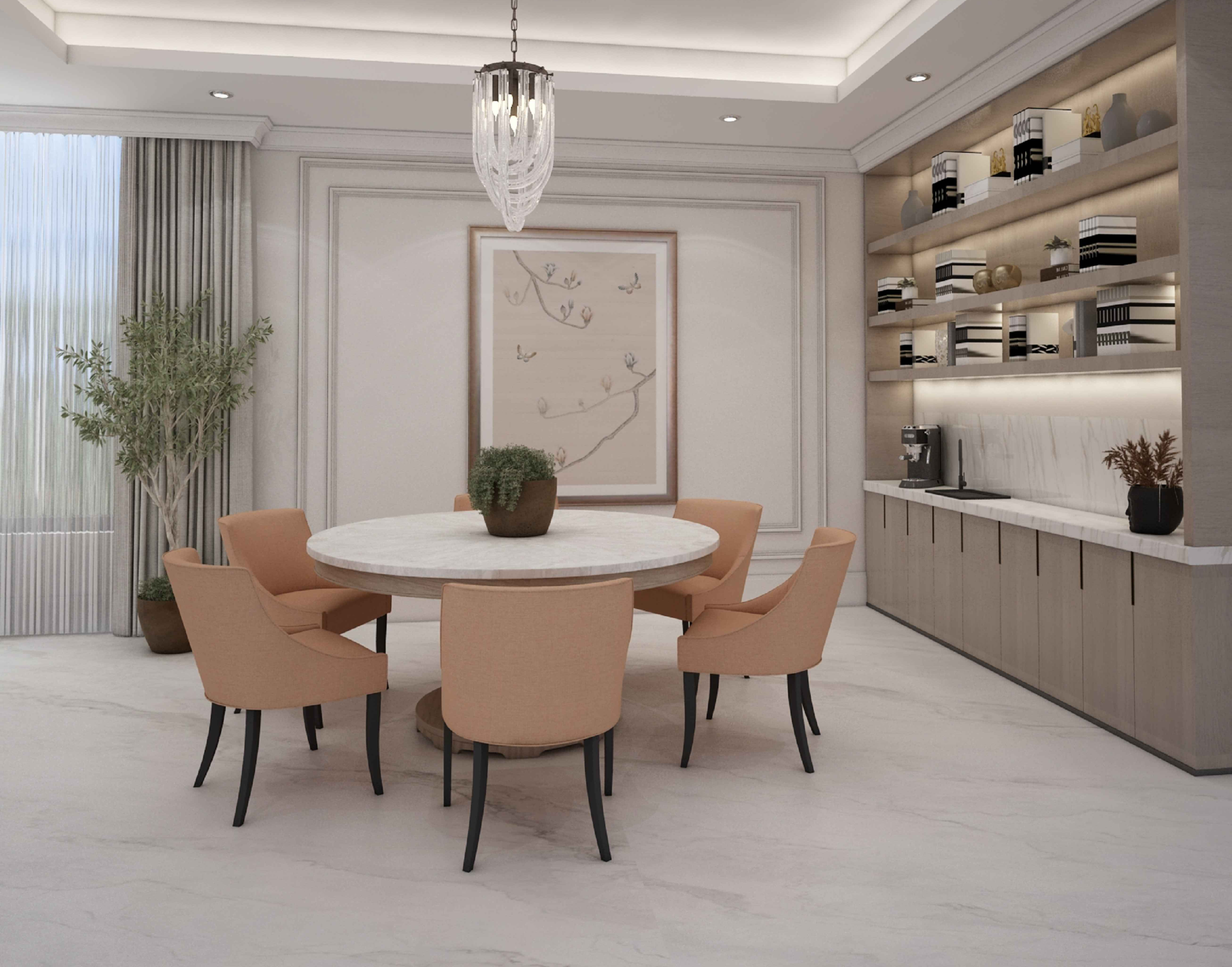 Two distinct dining spaces showcase EKAR’s versatility. A formal dining room features a 12-seater marble-topped table with a sculptural base, paired with custom upholstered chairs that marry comfort and style. For more intimate moments, a secondary dining nook boasts a round, wood-finished table and bespoke armchairs – all designed to reflect the client’s taste for both grandeur and intimacy. Every piece, from the table’s edge detailing to the chairs’ fabric stitching, is a testament to EKAR’s precision.