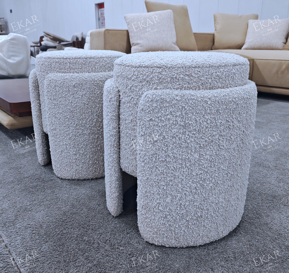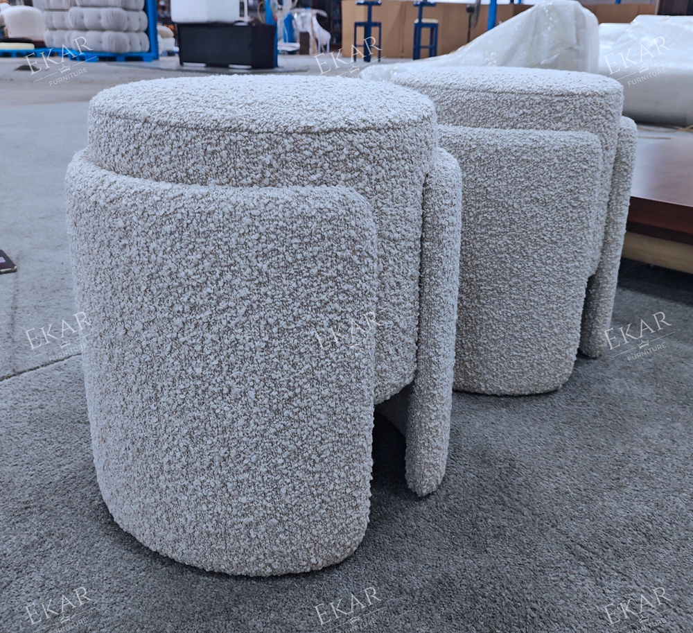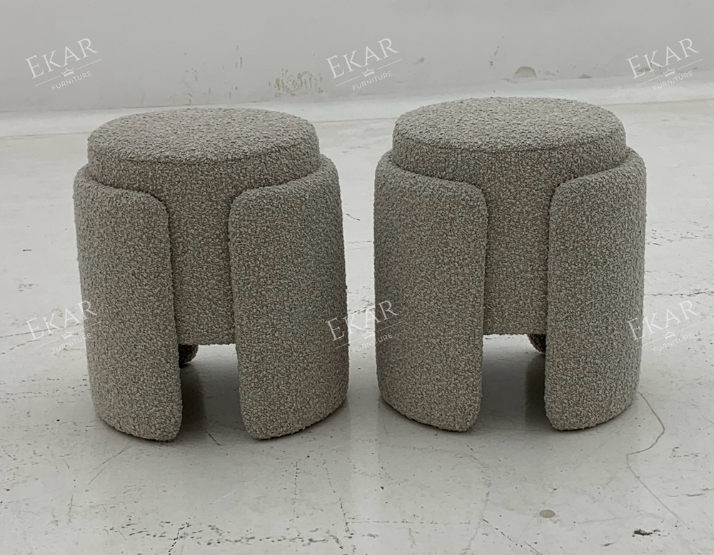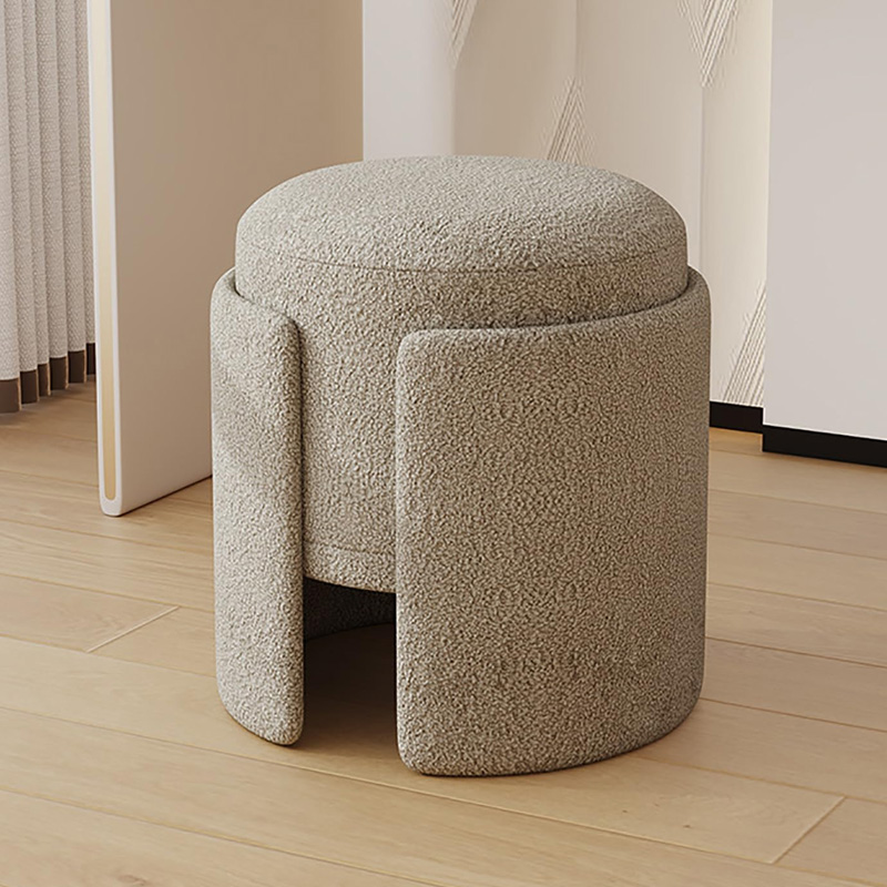 The visual appeal of the Vora lies in its perfect proportions and texture. The stool features a clean, round profile that softens the angular lines of typical bedroom furniture like dressers and wardrobes. It is fully upholstered in premium, high-touch fabric—typically available in a lustrous velvet or a textured boucle. This fabric choice catches the light softly, adding depth and warmth to the room.
