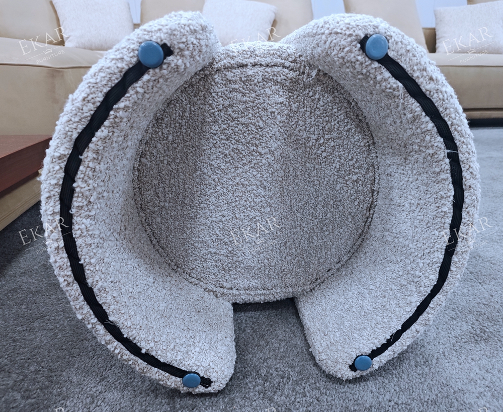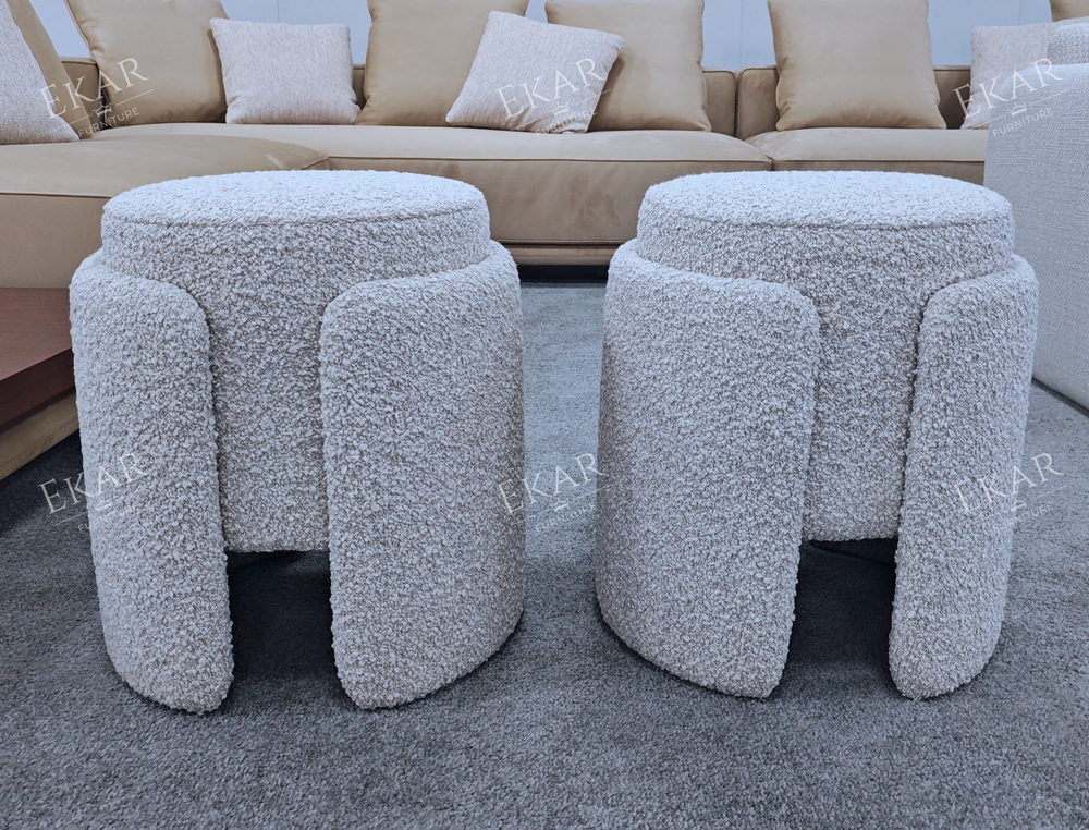 Grounding this plush seat is a distinct metallic accent at the base. Whether finished in a warm brushed gold or a cool polished chrome, this metal band adds a subtle shimmer and a sense of structural stability. The contrast between the soft, yielding fabric and the rigid, gleaming metal creates a harmonious balance, transforming a simple stool into a chic accent piece.